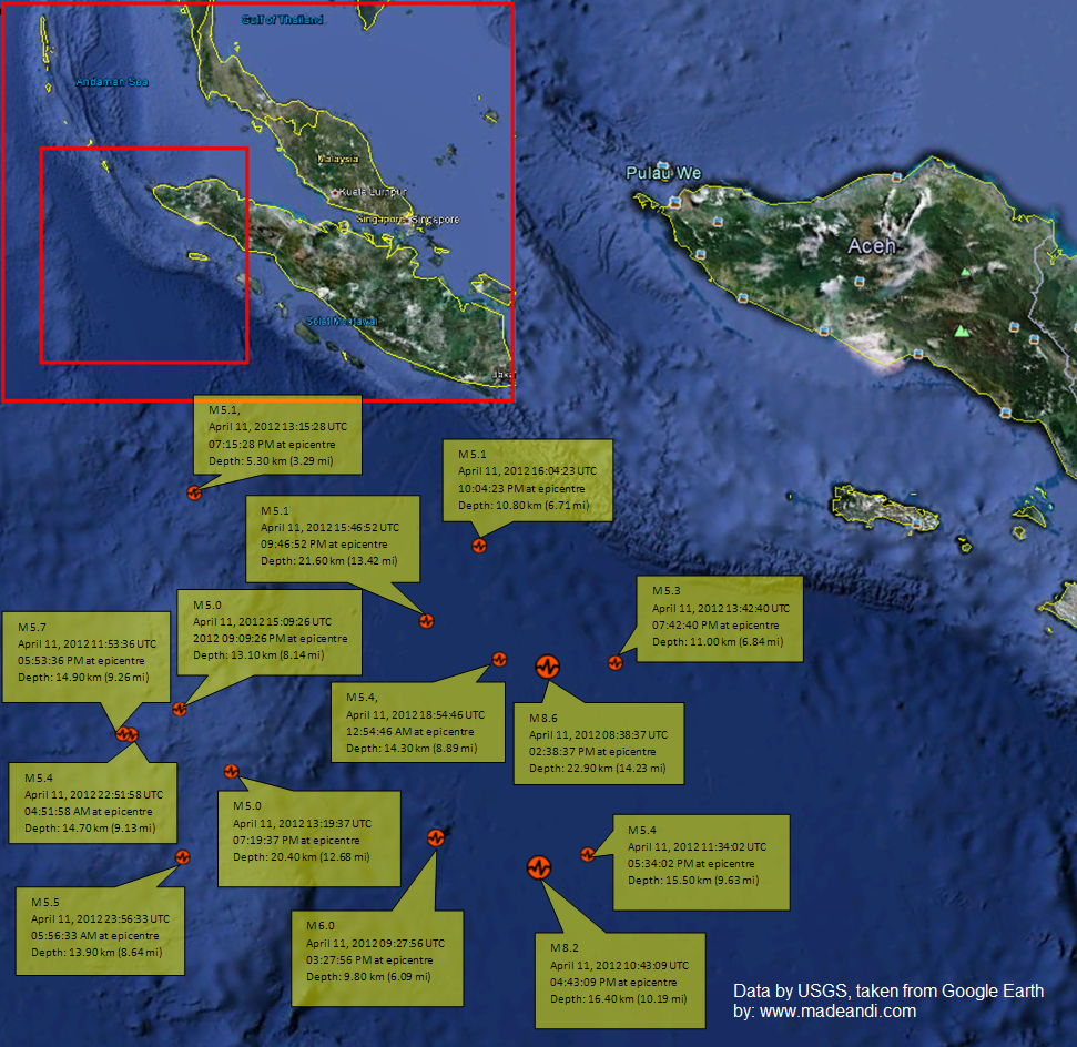 Earthquake in the west of Sumatera Around 14 earthquake ocurrance have been recorded by the United States Geological Survey (USGS) in the last two days. Here is the visualisation of the earthquake taken from Google Earth. May we be safe. Share this: Email a link to a friend (Opens in new window) Email Share on Facebook (Opens in new window) Facebook Share on X (Opens in new window) X More Share on Reddit (Opens in new window) Reddit Share on Tumblr (Opens in new window) Tumblr Share on Pinterest (Opens in new window) Pinterest Share on LinkedIn (Opens in new window) LinkedIn Print (Opens in new window) Print Like Loading... Author: Andi Arsana I am a lecturer and a full-time student of the universe View all posts by Andi Arsana