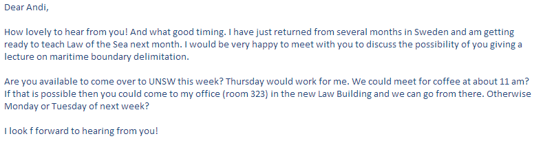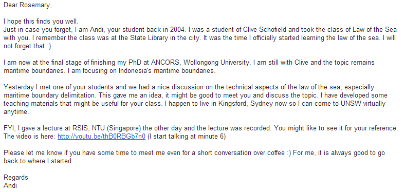 Suatu hari saya bertemu dengan seorang kawan Indonesia yang sedang kuliah di UNSW dan mengambil mata kuliah Hukum Laut yang diampu Rosemary. Kami sempat diskusi dan saya memberi beberapa masukan kecil terkait bahan kuliahnya. Rupanya kawan ini merasa terbantu dan secara berkelakar dia bilang “wah harusnya Mas Andi ni yang ngajar kita di kelas”. Tentu saja dia tidak serius tetapi saya menjadikannya inspirasi.